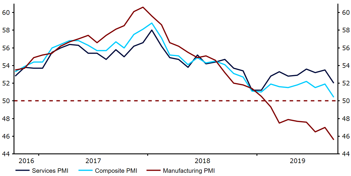 While the immediate prospect for a no-deal Brexit have receded further, there are increasing signs that the uncertainty is starting to take its toll on the British economy. This week’s business activity PMIs should confirm this trend.